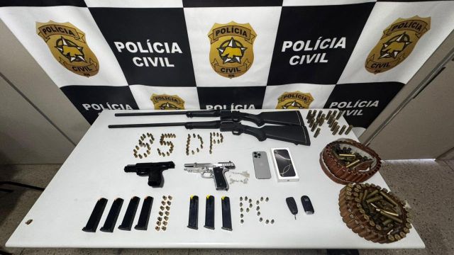 No total, foram apreendidas duas pistolas (calibres 9mm e .40), duas espingardas (calibres 28 e 32), grande quantidade de munições, dois veículos e um aparelho celular, que será submetido à análise pericial.