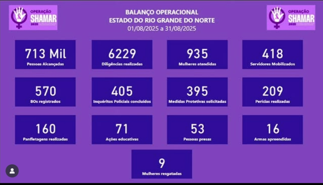 Embora o balanço divulgado se refira às ações de agosto, a Operação Shamar segue em andamento até esta quinta-feira, dia 04 de setembro, reforçando o trabalho permanente e integrado das forças de segurança do RN no enfrentamento à violência de gênero.