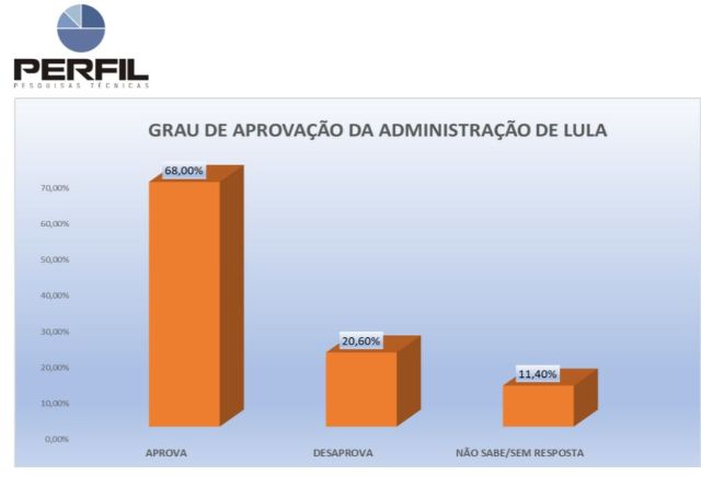 Pesquisa realizada pelo Instituto Perfil divulgada nesta sexta-feira (05/09) pelo blogdoBG, também revela que a gestão do Governo Lula tem aprovação de 68%; e 20,60% desaprovam; Não sabem dizer/sem resposta totalizam 11,40%.