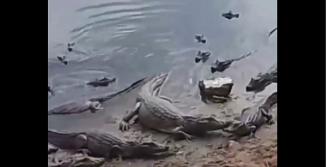 Um vídeo registrado na manhã desta segunda-feira (8) mostra dezenas de jacarés reunidos no local, reforçando a preocupação da população. O lago fica próximo a áreas residenciais, o que aumenta o risco de acidentes, especialmente com crianças e animais domésticos.