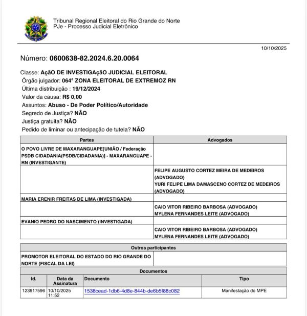O Ministério Público Eleitoral (MPE) se manifestou pela improcedência da ação movida contra a prefeita de Maxaranguape, Maria Erenir Freitas de Lima, e o vice-prefeito Evanio Pedro do Nascimento. A ação, apresentada pela coligação “O Povo Livre de Maxaranguape”, acusava os gestores de abuso de poder político e econômico durante as eleições de 2024, sob a alegação de contratações irregulares para fins eleitorais.