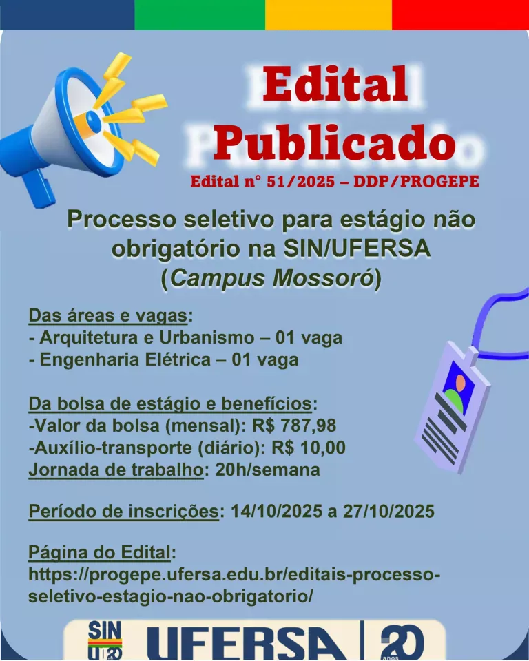 A Superintendência de Infraestrutura (SIN) da Universidade Federal Rural do Semi-árido (Ufersa) estará com inscrições abertas entre os dias 14 e 27 de outubro para a seleção de dois estagiários(as) das áreas de Arquitetura e Urbanismo e Engenharia Elétrica.