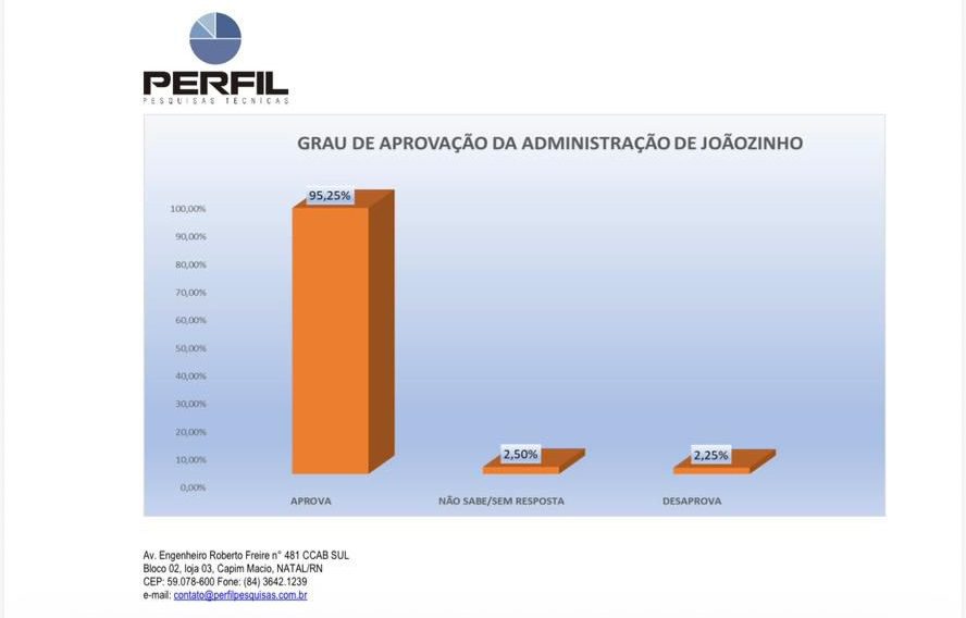 O prefeito de Serra Caiada, Joãozinho Furtado, alcançou o maior índice de aprovação entre os gestores municipais do Rio Grande do Norte, segundo pesquisa realizada pelo Instituto Perfil. O levantamento mostra que 95,25% dos serracaiadenses aprovam a gestão do prefeito, enquanto apenas 2,25% a desaprovam. Outros 2,50% dos entrevistados não souberam ou preferiram não opinar, evidenciando o alto nível de satisfação da população com o trabalho desenvolvido pela administração municipal.