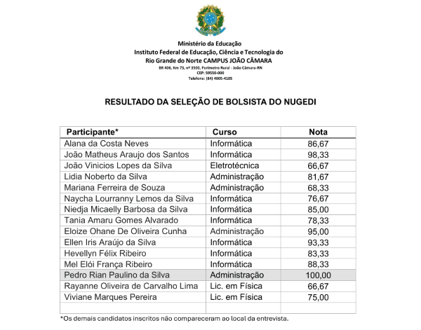 O NUGEDI/JC entrará em contato com o estudante selecionado para fornecer as informações necessárias à formalização da bolsa. As atividades do bolsista terão início no dia 18 de novembro.