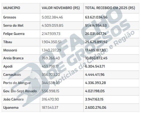 ANP divulga valores do repasse de royalties de novembro de 2025 aos municípios; João Câmara recebe mais de R$ 300 mil