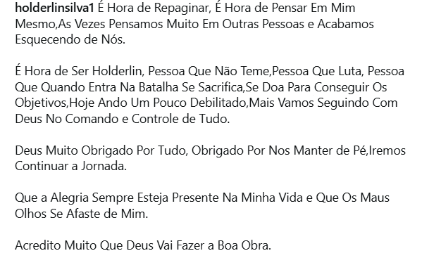 Na mensagem, Holderlin destaca a importância de manter a fé, a coragem e a disposição para lutar pelos objetivos, mesmo diante de desafios. Ele reconhece que atravessa um período de fragilidade, mas afirma seguir confiante, com Deus “no comando e controle de tudo”.