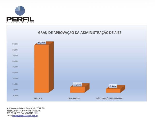 Pesquisa realizada pela Perfil Pesquisas Técnicas no dia 22 de dezembro aponta que a gestão municipal de João Câmara registra 89,40% de avaliação positiva. O levantamento ouviu 500 eleitores do município.
