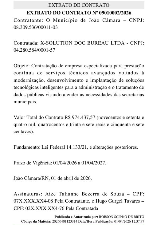 A Prefeitura de João Câmara firmou o Contrato nº 09010002/2026 com a empresa X-Solution Doc Bureau Ltda para a modernização dos serviços tecnológicos da administração municipal. O acordo prevê a prestação contínua de serviços técnicos avançados voltados ao desenvolvimento, implantação e aprimoramento de soluções inteligentes para o gerenciamento e tratamento de dados públicos.